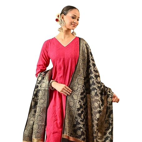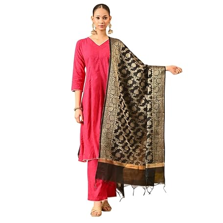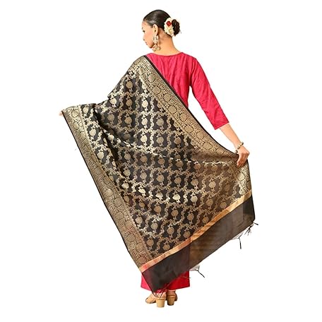• BioEarths Traditional Banarasi Silk Dupatta with Golden Floral Design, Zari Border, Indian Ethnic Dupatta (Black)