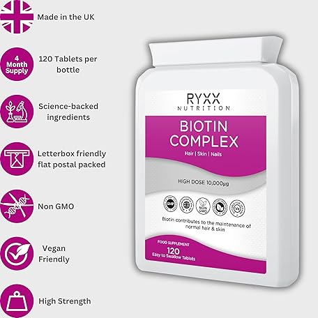 Sản phẩm Biotin Complex 10,000µg | High Strength Biotin for Hair Growth, Skin & Nails | 120 Vegan Tablets | Made in The UK by RYXX đang được bán với giá ưu đãi là $14.3008 tại nước Anh.