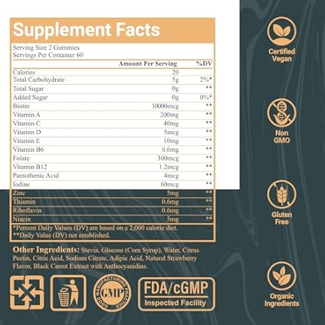 Thông tin sản phẩm Biotin Gummies, 10000 mcg, Hair Skin and Nail Support, with Vitamins A C D E B6 B12 and Zinc, Vegan, Sugar Free, 120 Count
