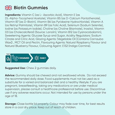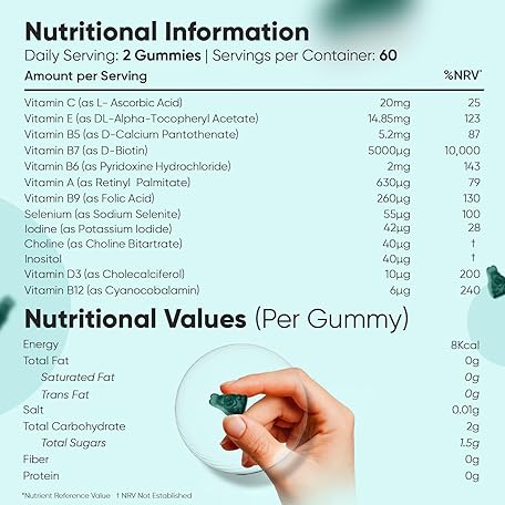 Thông tin sản phẩm Biotin Gummies - 120 Chewable B7 Vitamin Gummies - with 9 Essential Vitamins & 4 Nutrients - Biotin 5000mcg Supplements - Natural Mixed Berry Flavour - Non-GMO, Gluten-Free & Vegetarian-Friendly