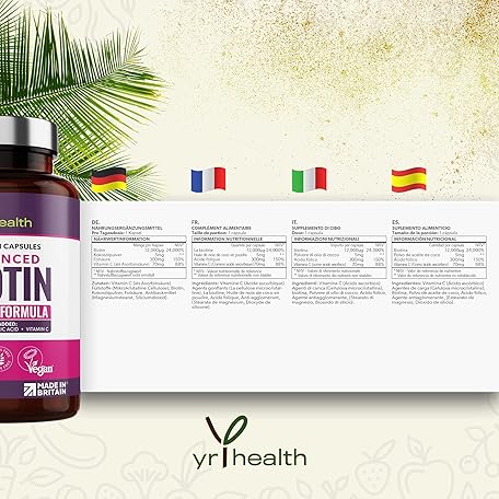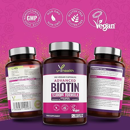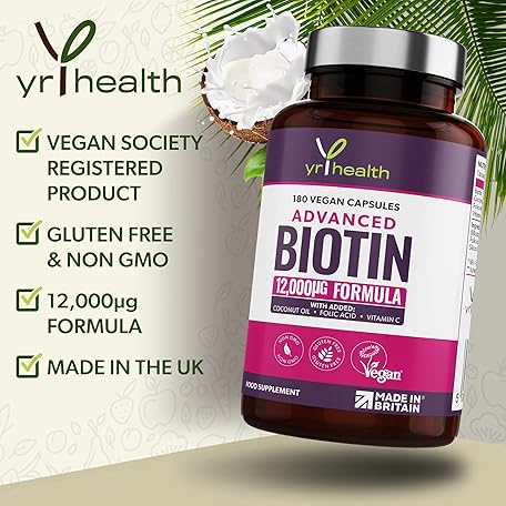 Thông tin sản phẩm Biotin Hair Growth Supplement 12,000mcg, 180 Vegan Capsules not Biotin Tablets for Hair Skin and Nails with Coconut Oil, Vitamin C & Folic Acid, Vitamin B7 for Men and Women - Made in UK by YrHealth