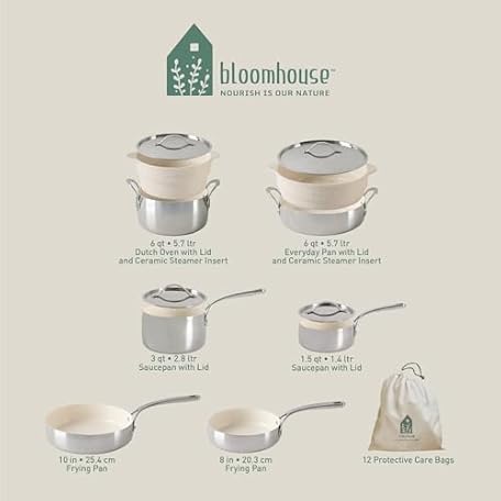 Thông tin sản phẩm Bloomhouse - Oprah's Favorite Things - 12 Piece Triply Stainless Steel Pots and Pans Cookware Set w/Non-Stick Non-Toxic Ceramic Interior, Ceramic Steamer Inserts, & 12 Protective Care Bags