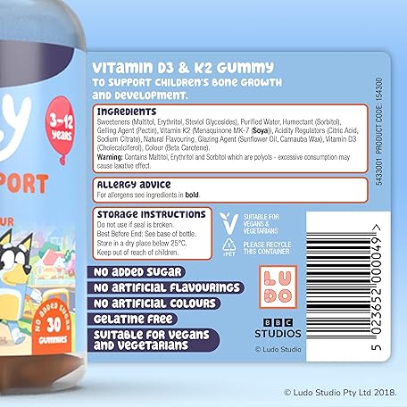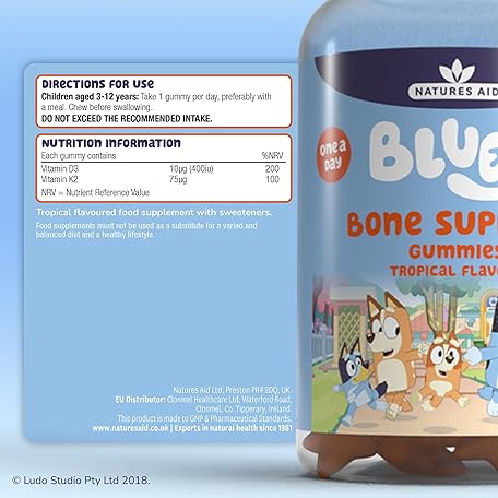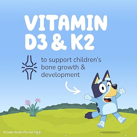 Thông tin sản phẩm Bluey Kids Bone Support Gummies - Vitamin D3 & K2 to Support Growing Bodies and Bone Growth - Tropical, No Added Sugar, Vegan, Gluten Free - 30 Gummys for Children Ages 3-12