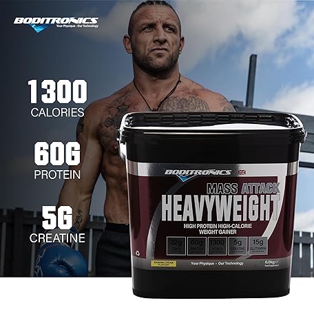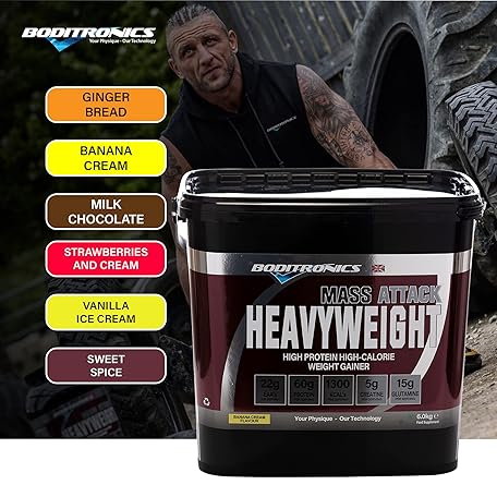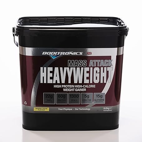 Sản phẩm Boditronics Mass Attack Heavyweight Mass Gainer Protein Powder with 60g Protein, 214g Carbohydrates and 5g Creatine per Serving, Banana Cream, 6 kg đang được bán với giá ưu đãi là $78.8615 tại nước Anh.