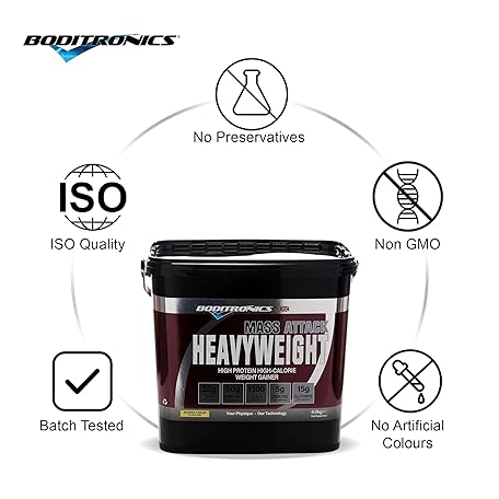 Thông tin sản phẩm Boditronics Mass Attack Heavyweight Mass Gainer Protein Powder with 60g Protein, 214g Carbohydrates and 5g Creatine per Serving, Banana Cream, 6 kg