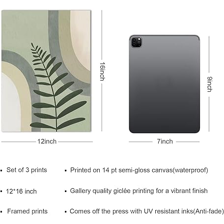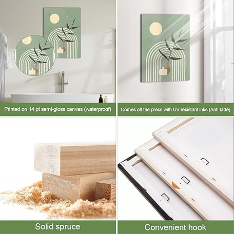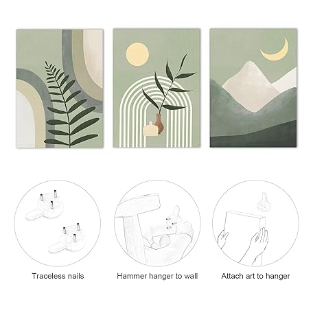 Thông tin sản phẩm Boho Wall Art Painting,Boho Wall Art Set of 3, Sage Green Minimalist Framed Canvas Wall Art Geometric Leaf Sun Moon Beige Green Canvas Artwork 12"X16" for Bathroom Living Room Boho Wall Decor