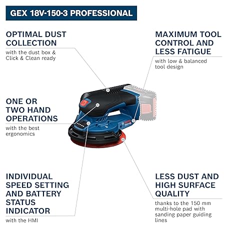 Thông tin sản phẩm Bosch Professional 18V System Cordless Sander GEX 18V-150-3 (incl. 1x Sanding Paper, 1x Dust Box, 1x Guard Ring)