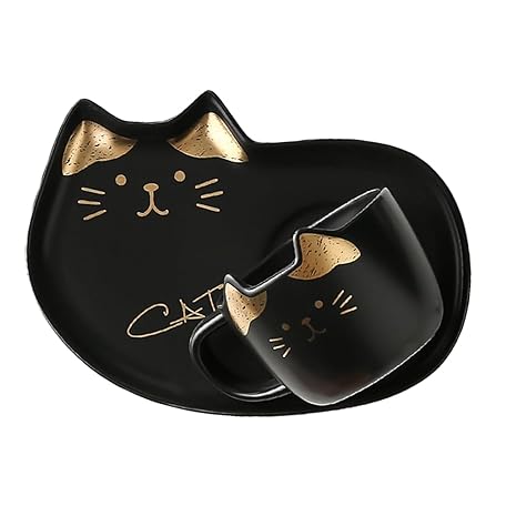 BRIGHTFUFU 1 Set Black Ceramic Cat Design Coffee Mug and Saucer Cute Drink Cup for Home Office Ideal for Tea Milk and Snacks
