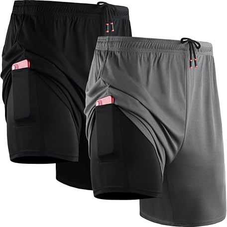 Cadmus Men's 2 in 1 Running Shorts with Liner,Dry Fit Workout Shorts with Pockets,1070,2 Pack,Black/Grey,M