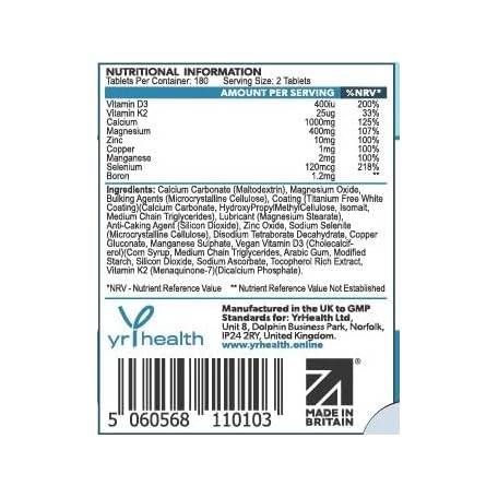 Thông tin sản phẩm Calcium, Magnesium, Zinc and Vitamin D Plus Vitamin K2 MK-7 Tablets - Osteo Supplement - 180 Vegan Tablets not Capsules - Made in The UK by YrHealth