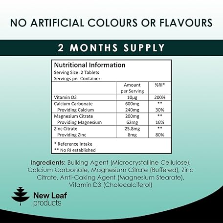 Sản phẩm Calcium Magnesium Zinc and Vitamin D Supplement - 120 High Strength Tablets Supplement with Magnesium Vitamin D, Zinc Tablets Complex Made in The UK by New Leaf đang được bán với giá ưu đãi là $12.8402 tại nước Anh.