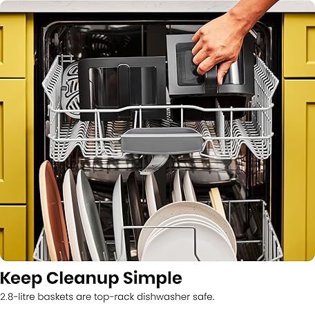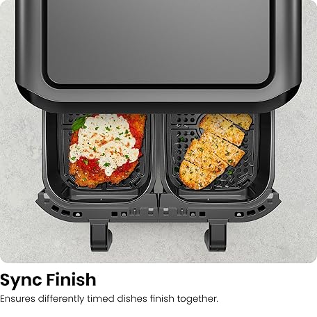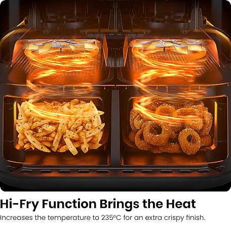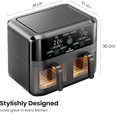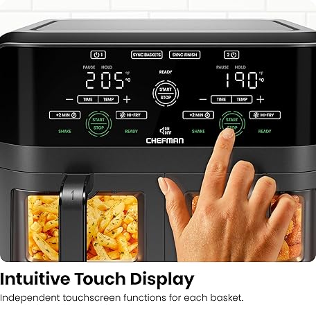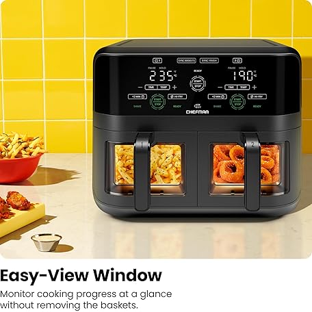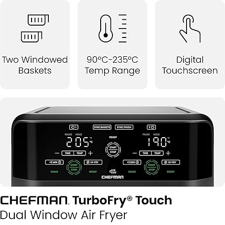 Thông tin sản phẩm Chefman 5.6L Dual Air Fryer Oven, Dishwasher Safe Frying Baskets, Double Air Fryer with Sync Finish, Hi-Fry, Auto Shutoff and Easy View Windows, Black