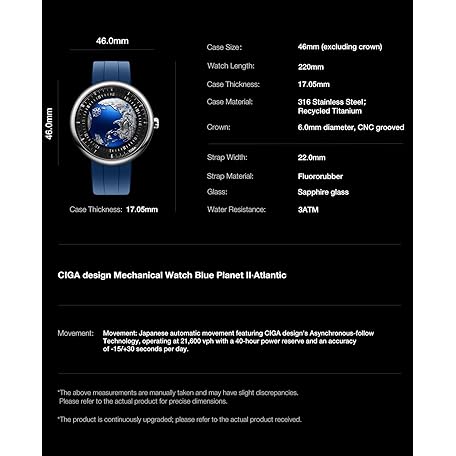 Thông tin sản phẩm CIGA Design Mechanical Automatic Watch Blue Planet II·Atlantic, Round Stainless Steel Case, Earth-Like dial Design, Luminous Version, Premium Fluororubber Strap Watches Gifts for Men and Women