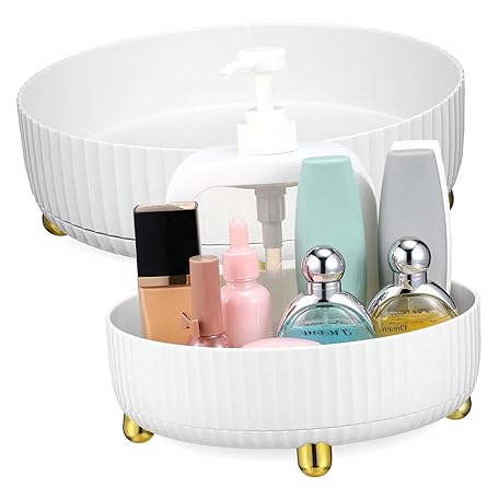 Ciieeo Rotating Cosmetic Storage Box Desktop Makeup Organizer Tray Pearl White Large and Small Set 2pcs Turntable Skincare Storage for Bedroom Bathroom