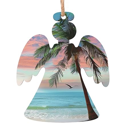 Coconut Palm Tree Sandy Beach Printed Wooden Christmas Decorations 4 PCS - Angel-Shape Hanging Ornaments for Holiday Christmas Trees Hanging Party Decorations