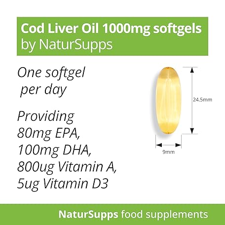 Thông tin sản phẩm Cod Liver Oil Capsules High Strength 1000mg, 365 Omega 3 Softgels, EPA DHA Vitamin A Vitamin D3, 1 Year Supply, Gluten Free, UK Made by Natur Supps
