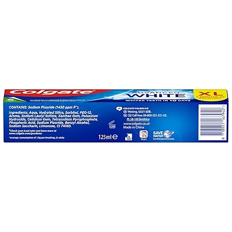 Sản phẩm Colgate Advanced White Toothpaste 125ml - Teeth whitening Toothpaste - clinically Proven whitening - whitens in 10 Days - with Active Micro-Cleansing Crystals - New Stain Prevention - Enamel Safe đang được bán với giá ưu đãi là $4.142 tại nước Anh.