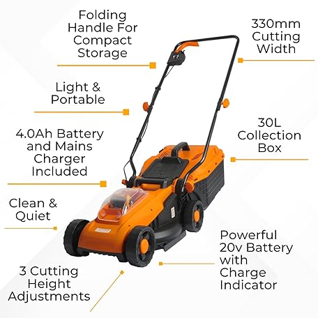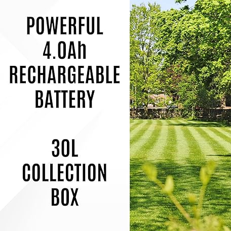 Sản phẩm Cordless Lawnmower With 4.0Ah Battery and Charger - 330mm Cutting Width - 3 Cutting Heights 25mm to 65mm - 30 Litre Collection Box - Lightweight and Compact (Lawn Mower & Battery & Charger) đang được bán với giá ưu đãi là $183.2617 tại nước Anh.