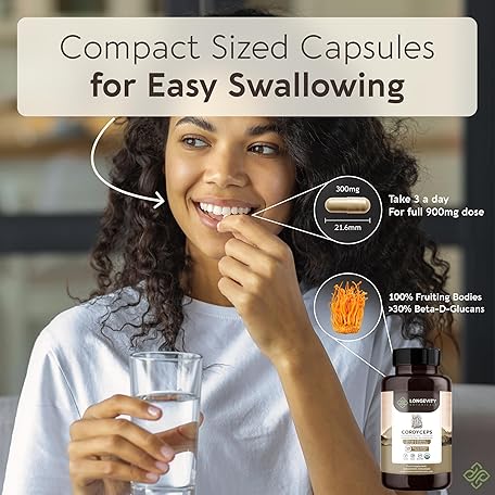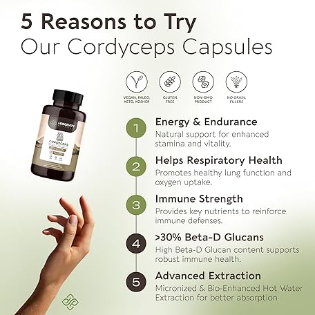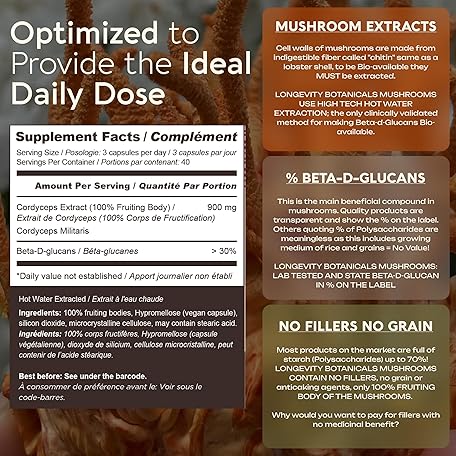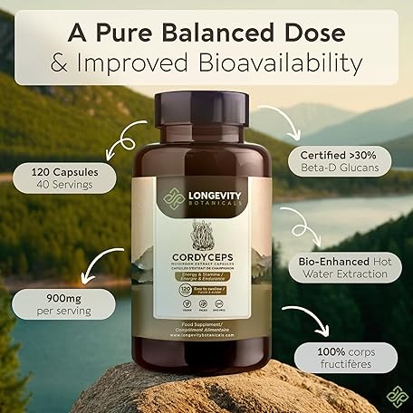 Thương hiệu Longevity Botanicals là cái tên nổi tiếng được rất nhiều khách hàng trên thế giới chọn lựa. Với kiểu dáng đẹp mắt, sang trọng, sản phẩm Cordyceps Mushroom Capsules Supplement (120) | Pure Fruiting Body 10:1 High Strength Extract | 30% Beta-D Glucans | 9,000mg Raw Equivalent Per Serving | No Fillers | Energy, Stamina & Oxygen Support là sự lựa chọn hoàn hảo nếu bạn đang tìm mua một món cho riêng mình.