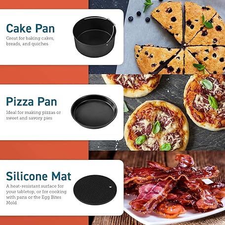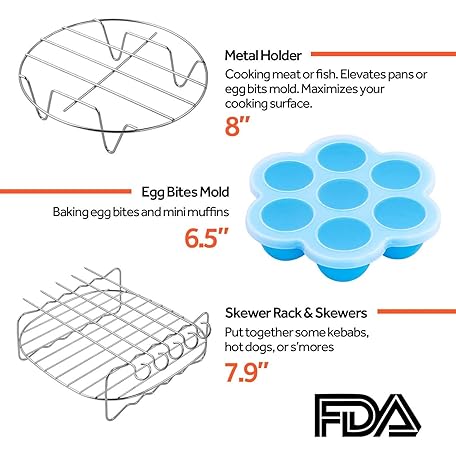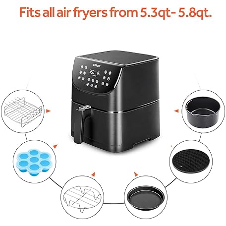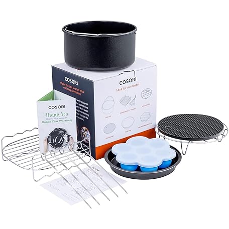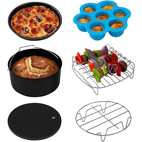 Thông tin sản phẩm COSORI Air Fryer Accessories Set, Fit All of Brands 5.5 L, Pack of 6 Including Cake Pan/Pizza Pan/Metal Holder/Multi-Purpose Rack with Skewers/Silicone Mat/Egg Bites Mold with Lid