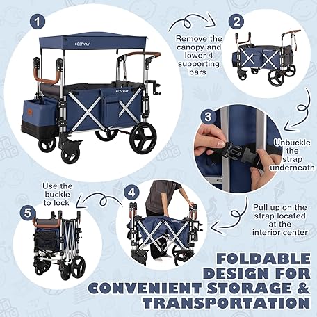Thông tin sản phẩm COSTWAY Push Pull Stroller Wagon for 2 Kids, Collapsible Trolley with Adjustable Handle Bar, Removable Canopy, 5-Point Harness and Drapes, Outdoor Camping Cargo Cart (Navy)