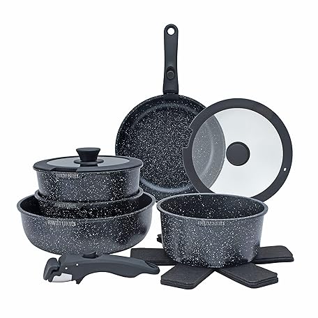 Country Kitchen 13 Piece Pots and Pans Set - Nonstick Cookware Set Detachable Handle, Non Stick Kitchen Cookware Sets Removable Handle, RV Cookware Set, Dishwasher/Oven Safe (Black) (YFAC13RH BLK)