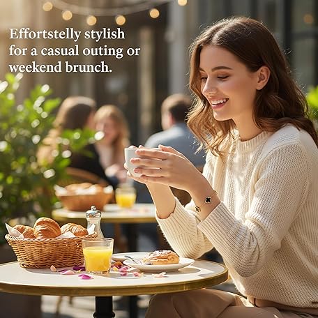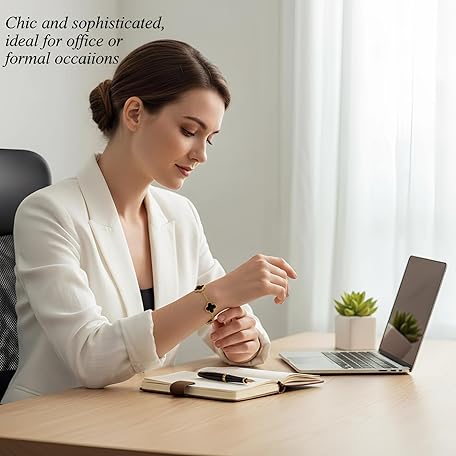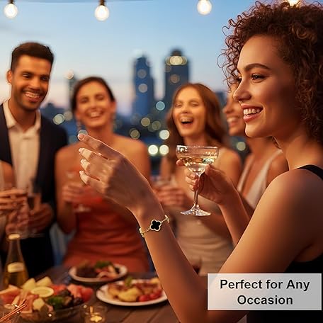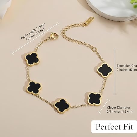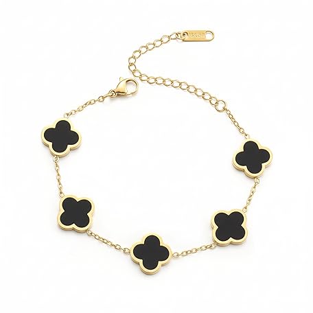 Dainty Four Leaf Clover Bracelet for Women - Stainless Steel goldChain with Black Charms - Elegant Everyday Jewelry