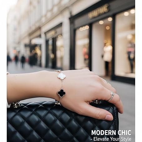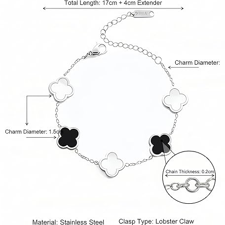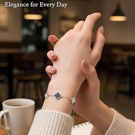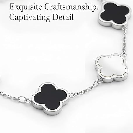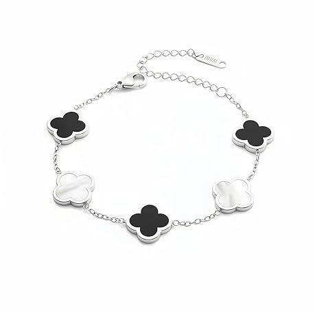 Dainty Four Leaf Clover Bracelet for Women - Stainless Steel Silver Chain with Black & White Charms - Elegant Everyday Jewelry