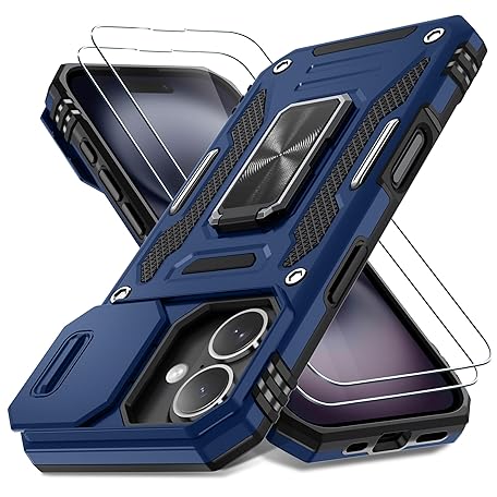 DEERLAMN Case for iPhone 16 with Slide Camera Cover+Screen Protector (2 Packs), Rotated Ring Kickstand Military Grade Shockproof Protective Cover-Navy Blue