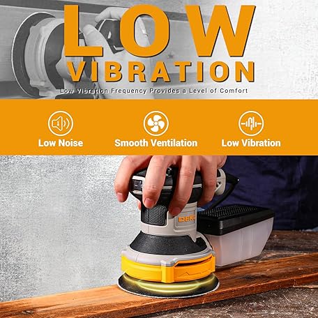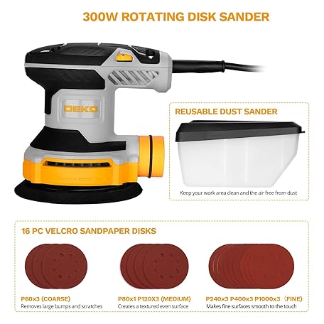 Thông tin sản phẩm DEKOPRO Random Orbit Sander 300W with 16Pcs Sandpapers, 6 Variable Speed 14000RPM, 125MM Hand Electric Tool, Dust Removal Function, Fit for Woodworking/Sanding