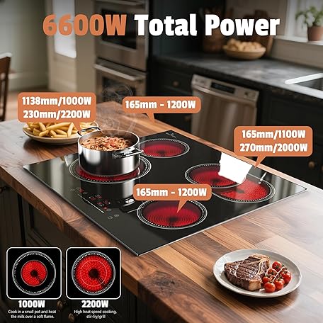 Sản phẩm DELITEER Electric Hob 60cm, 4 Zone Ceramic Hob 6600W, Built-in 60cm Electric Ceramic Hob with Oval Zond and Double-ring burner, 99 Mins Timer, No Plug đang được bán với giá ưu đãi là $147.368 tại nước Anh.