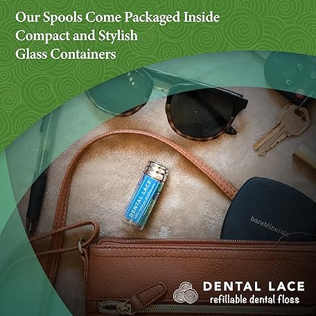 Thông tin sản phẩm Dental Lace Refillable Silk Dental Floss – 100% Silk Floss with Mint Flavor, PFAS & PTFE Free – 1 Refillable Pink Glass Floss Container and 2 Spools (66 Yards) - Recyclable Packaging (Pack of 2)