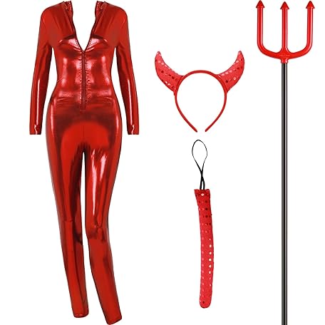 Devil Costume Set Includes Red Bodysuit Devil Tail Devil Fork Glitter Devil Horns Headband (L)