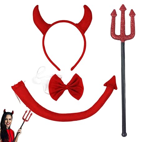 Devil Horns and Fork Costume Set, Devil Horns Headband, Tail, Bow Tie, Adult Unisex Halloween Costume Party Headwear (Red)