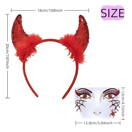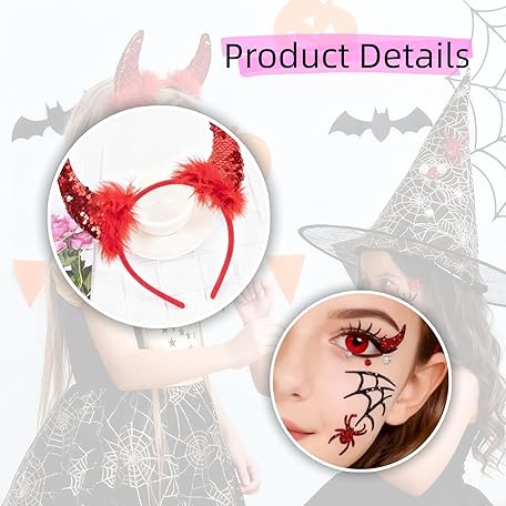 Thông tin sản phẩm Devil Horns Headband with Spider Face Stickers, Sparkles Halloween Hairband for Women Men Adults, Fancy Dress Party Accessory Kit