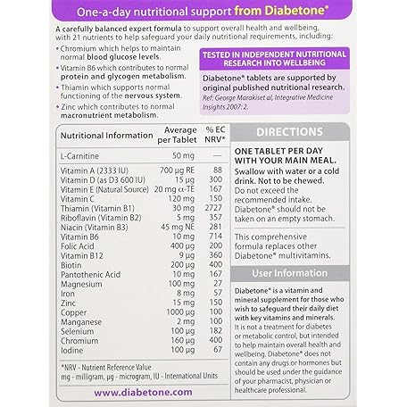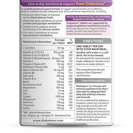 Thông tin sản phẩm Diabetone Original Formula Supports Glicemia Control and Diabetes Management Supplement - 30 Tablets, 30-Day Supply, by Vitabiotics