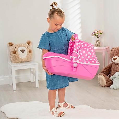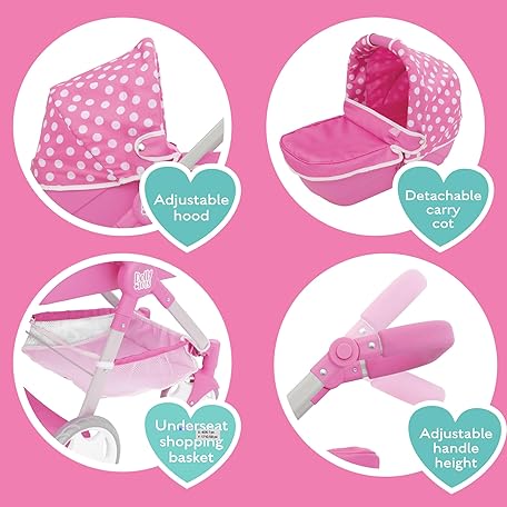 Thông tin sản phẩm Dolly Tots Junior Roamer Dolls Pram | Pink Polka Dot Pushchair with Detachable Carry Cot, Adjustable Handle & Storage Basket | Includes Changing Bag | Toy Travel System for Kids Ages 3+