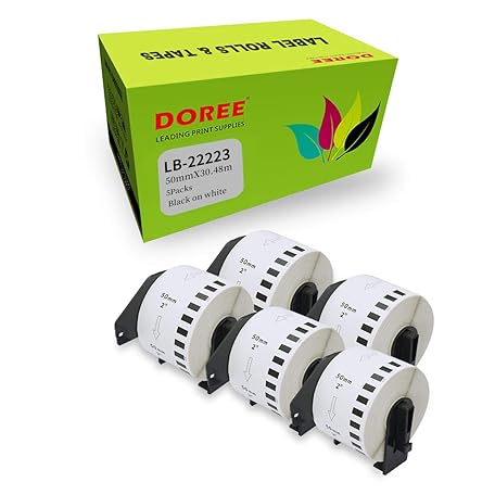DOREE 5 Rolls DK-22223, 50mm x 30.48m, Continuous Thermal Labels White on Black. DK22223 Compatible with Brother QL-500, QL-550, QL-570, QL-700, QL-800... Brother QL Series.