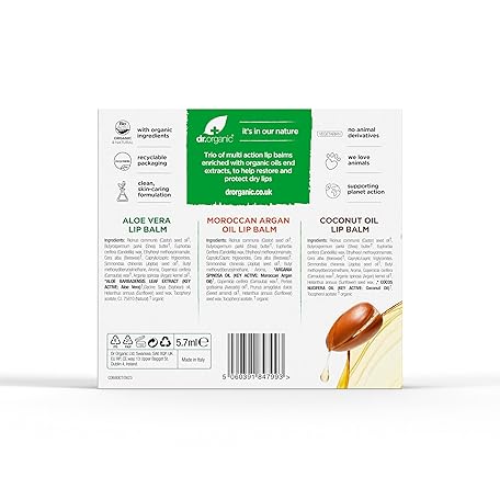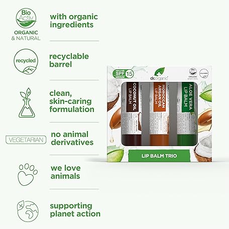 Thông tin sản phẩm Dr Organic Lip Balm Gift Set, Moisturising, SPF 15, Assorted Multipack with Aloe Vera, Argan Oil, Coconut Oil, Natural, Vegetarian, Cruelty-Free, Paraben & SLS-Free, Organic, 5.7ml