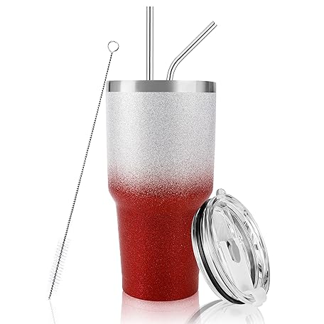 D·S 30 oz Tumbler Christmas Red Glitter Gradient Cup Stainless Steel Double Wall Vacuum Insulated Mug with Straw and Lid, Cleaning Brush for Cold and Hot Beverages
