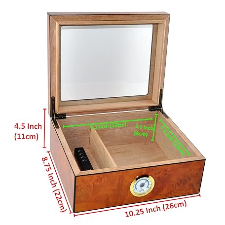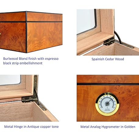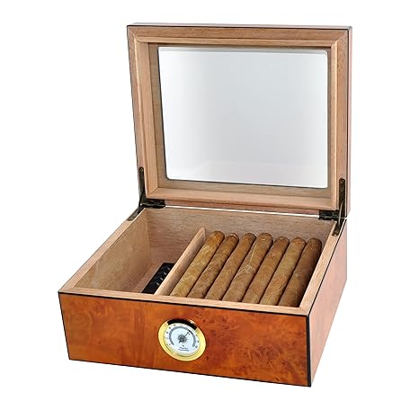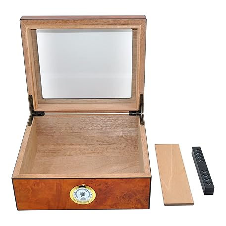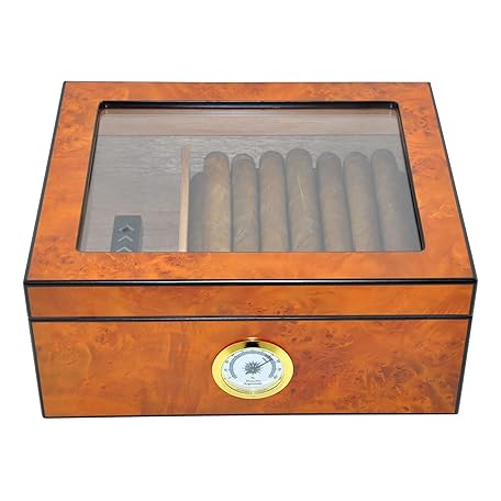 DUCIHBA Cigar Humidor Case, Holds 25-50 Cigars, Tempered Glass Top Display, Handcrafted Spanish Cedar Wood Desktop Cigar Box with Divider, Humidifier, Hygrometer, Burlwood Blond,