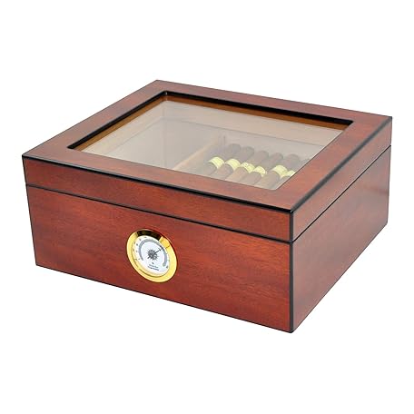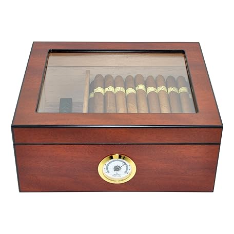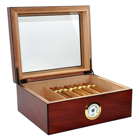 Thông tin sản phẩm DUCIHBA Cigar Humidors Storage 25-50 Cigars Box, Tempered Glass Top Display, Handcraft Spanish Cedar Wood Cigar Case with Divider, Humidifier and Hygrometer, Gift for Man, Sapele Cherry