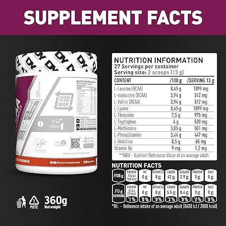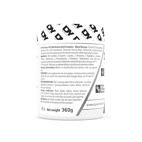 Thông tin sản phẩm DY Nutrition HIT EAA Essential Amino Acids Complex with BCAAs, L-Lysine & Vitamin B6 | Muscle Repair & Recovery Supplement Intra Workout Powder, 27 Servings, 360g (Blood Orange)