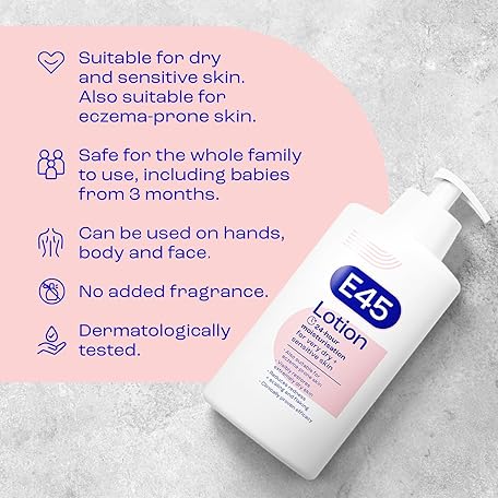 Thương hiệu E45 là cái tên nổi tiếng được rất nhiều khách hàng trên thế giới chọn lựa. Với kiểu dáng đẹp mắt, sang trọng, sản phẩm E45 Moisturising Lotion 500 ml for Dry & Sensitive Skin - Long-Lasting Hydration Protect from Dryness, Reduce Redness - Dermatological Body Moisturiser Lotion - Body Lotion - Daily Moisturiser là sự lựa chọn hoàn hảo nếu bạn đang tìm mua một món cho riêng mình.