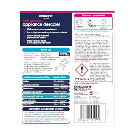 Thông tin sản phẩm EcoZone Multi-Purpose Appliance Descaler, Internal Cleaner for Kettles, Irons, Washing Machines, Coffee Makers, Dishwashers, Fixtures & Surfaces, Natural Vegan & Non Toxic Eco-Friendly Liquid (500ml)