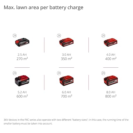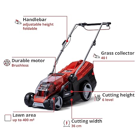 Thông tin sản phẩm Einhell GE-CM 36/36 Li cordless lawn mower (PXC, li-ion, brushless motor, 6-level cutting height adjustment facility, 2x 4.0 Ah rechargeable batteries + 2x chargers)