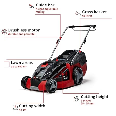 Thông tin sản phẩm Einhell Power X-Change 36/43 Cordless Lawnmower With Battery (x2) and Charger (x2) - 36V, 43cm Cutting Width, 63L Grass Box, 6 Cutting Heights, Mulching - GE-CM 43 Li M Battery Lawn Mower Red / Black