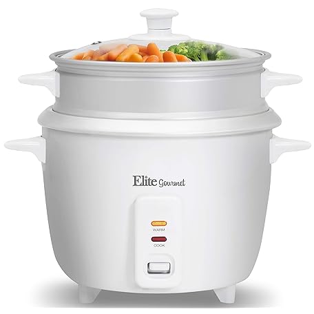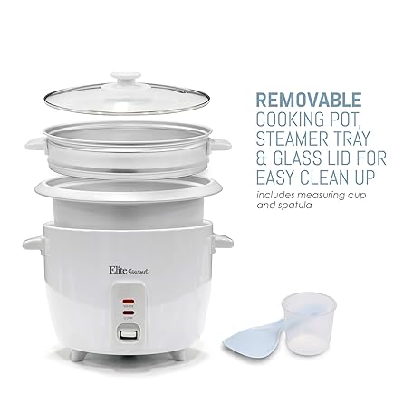 Elite Gourmet ERC-003ST Rice Cooker with Steamer Basket, Glass Lid, One-Touch Switch with Automatic Keep Warm Function, Makes Soups, Stews, Grains, Hot Cereals, 6 Cups Cooked (3 Cups Uncooked), White