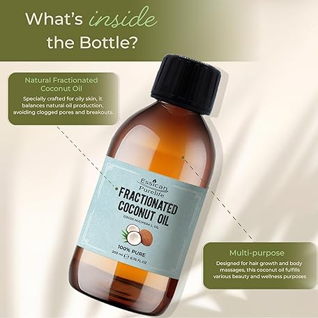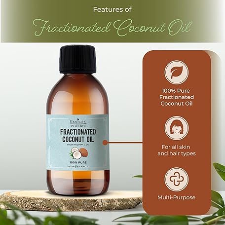 Thông tin sản phẩm Essican Purelife, Pure Coconut Oil Liquid, 200ml MCT Fractionated Coconut Oil for Skin, Hair & Lip, Carrier Oils for Essential Oils Mixing & Massage, Supports Healthy Hair Growth & Hydrated Skin
