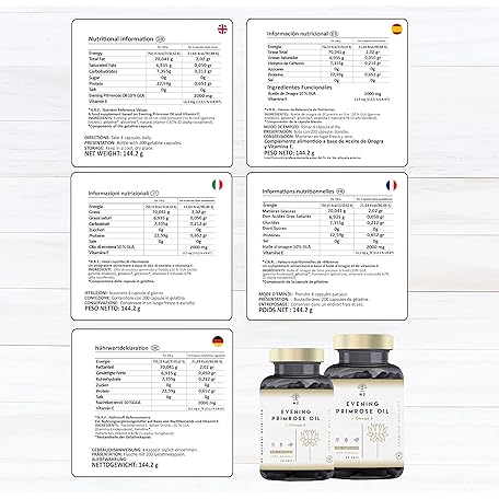 Thông tin sản phẩm Evening Primrose Oil 2000 mg per dose, GLA Omega 6 200mg + Vitamin E. 200 High Strength Softgels, Easy Swallow, Cold Pressed. Menopause, Skin and Nails Care. Made in EU. N2 Natural Nutrition.